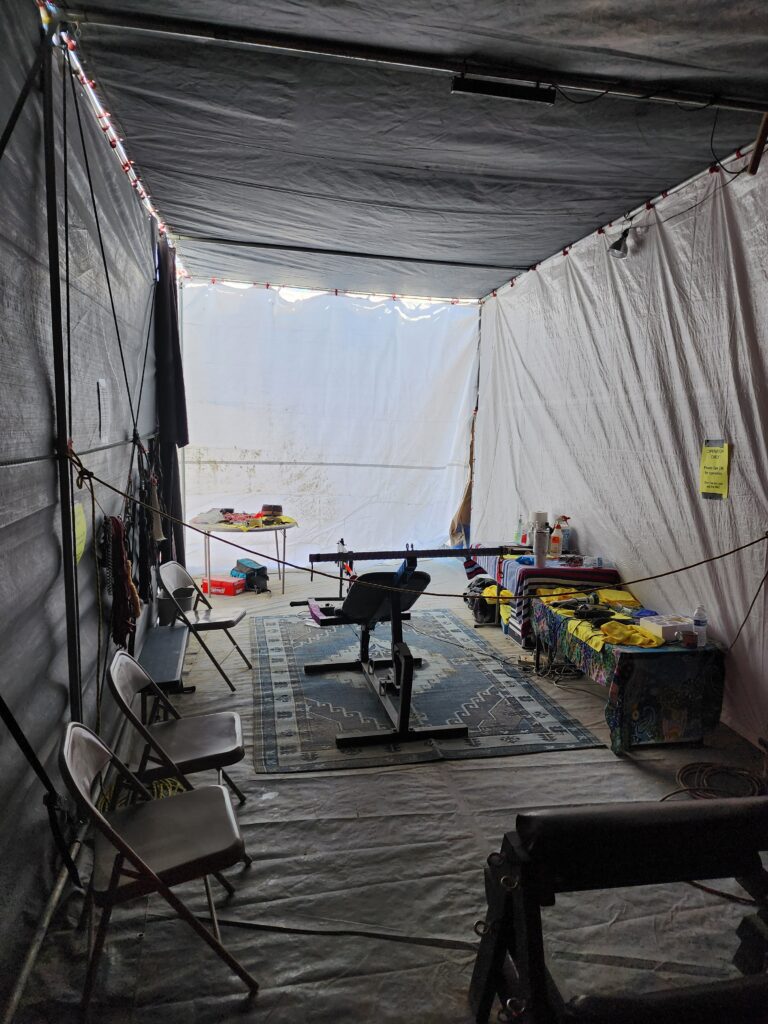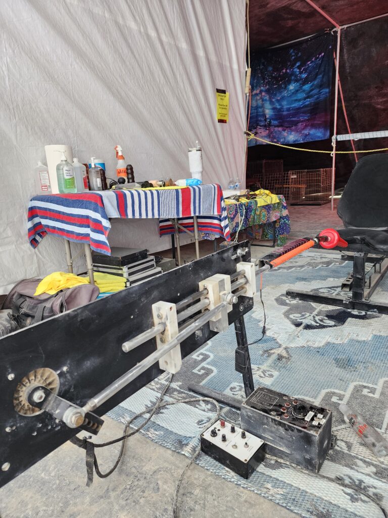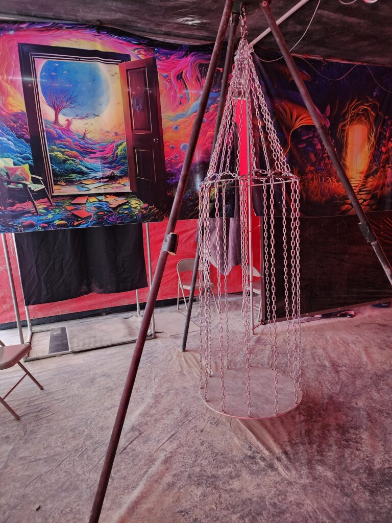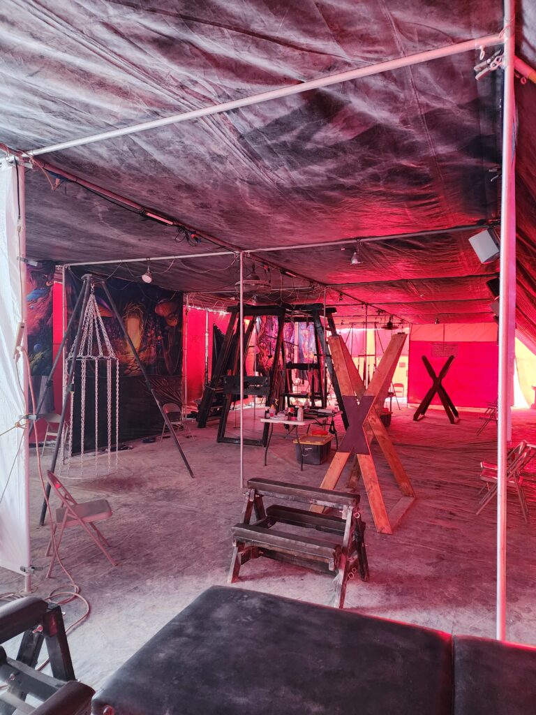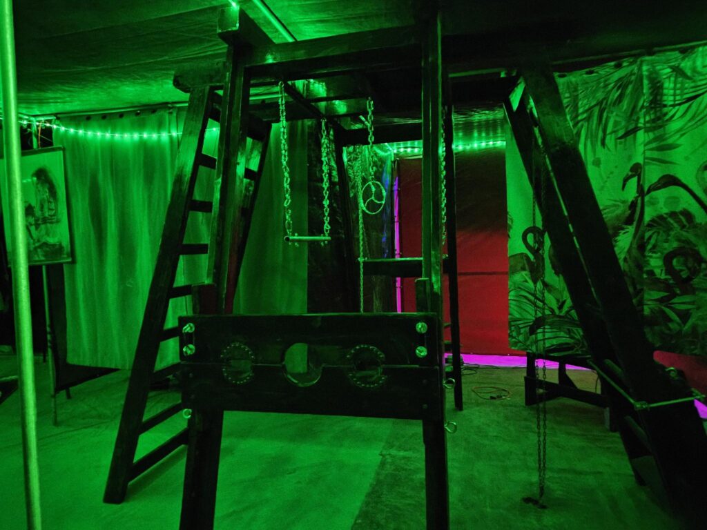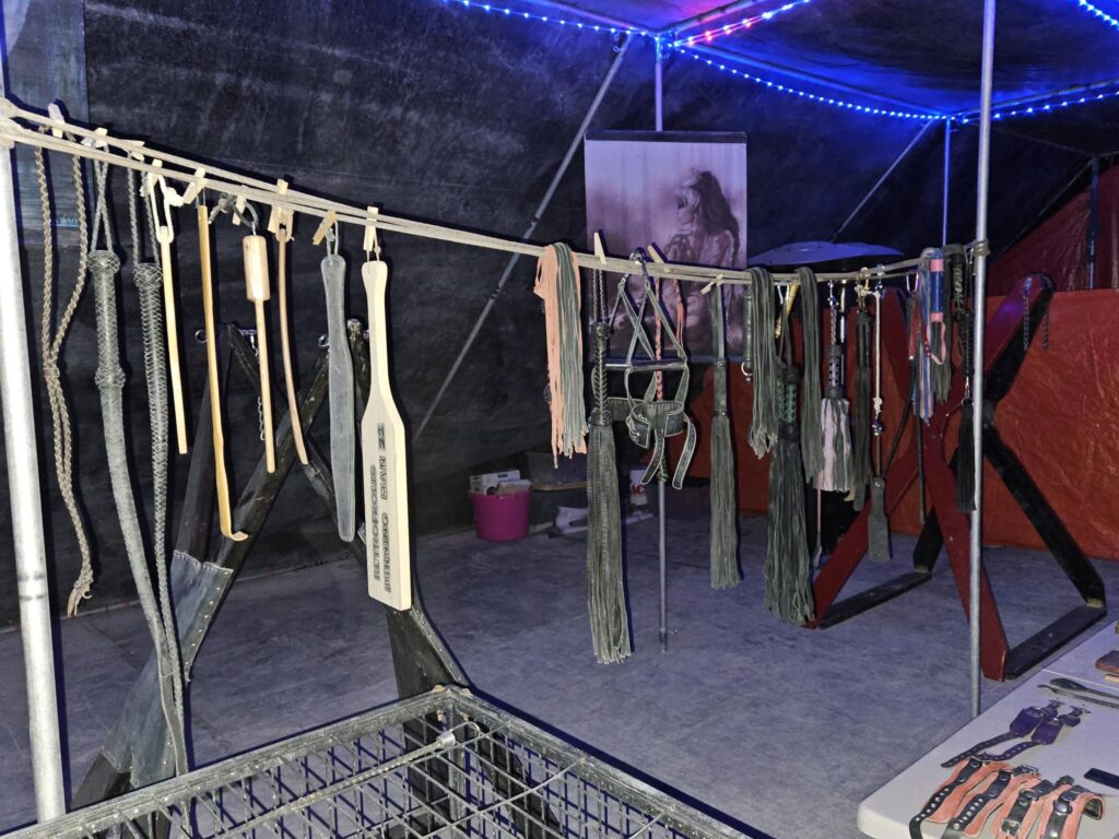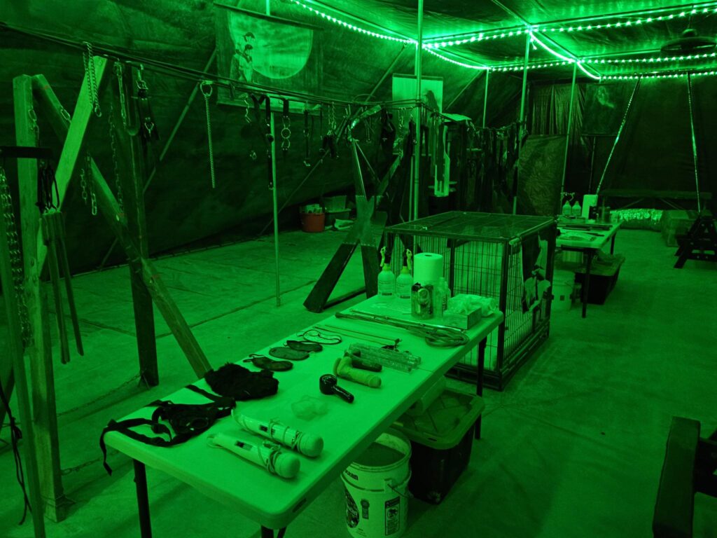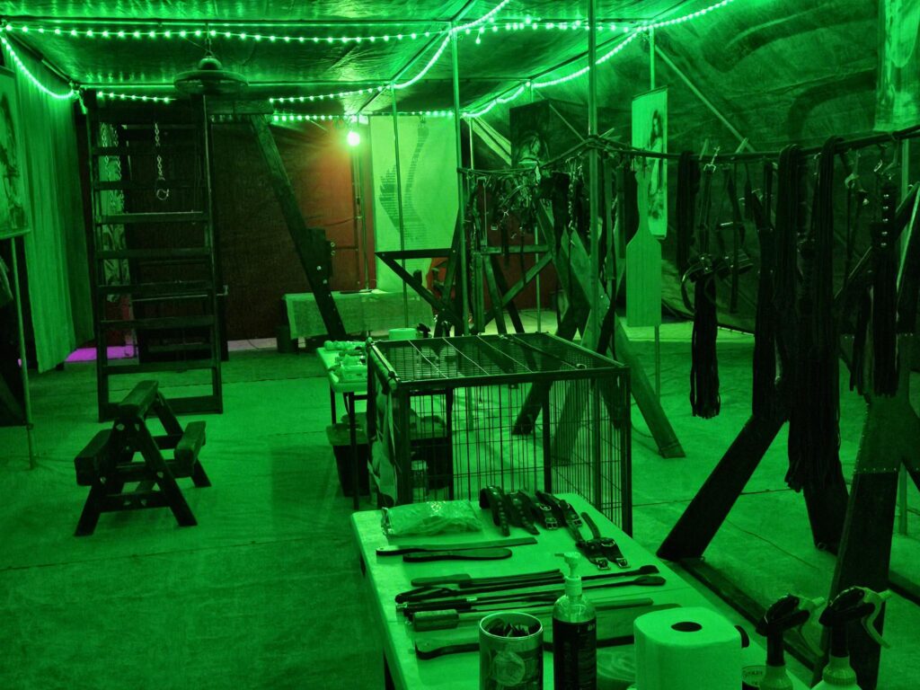 Our Dungeon is the crown jewel of Camp Retrofrolic; open day and night it’s a fully equipped, immersive space that’s widely regarded as the best on the playa. It is our gift to the Burning Man community, offering a sanctuary of consensual exploration, connection, and play.